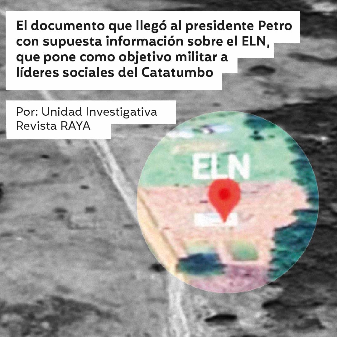 El material conocido por RAYA, que circuló en pleno estado de Conmoción Interior, mezcla en su contenido supuestos movimientos del ELN con datos no verificados que vinculan a líderes sociales y funcionarios públicos con esa guerrilla. Entre los mencionados hay un exsenador, un personero municipal, exalcaldes, concejales, funcionarios de la Defensoría del Pueblo, un miembro de la iglesia católica y un funcionario de Naciones Unidas. No se presentan pruebas que respalden esas acusaciones.