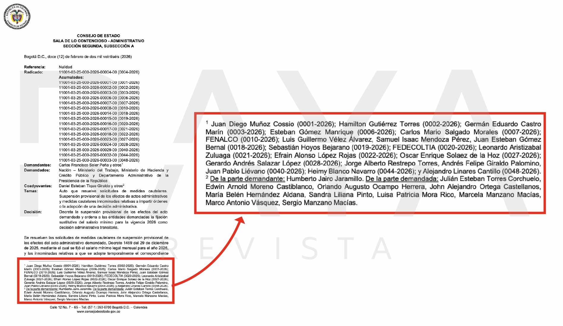 Detrás de los expedientes que llevaron al Consejo de Estado a declarar la suspensión del decreto, figuran líderes gremiales como Jaime Alberto Cabal de Fenalco, concejales y dirigentes del Centro Democrático, candidatos al Congreso y reconocidos abogados y lobbistas de grandes empresas, quienes han impulsado el hundimiento en el Congreso de reformas como la laboral. RAYA identificó lo que representan las personas que demandaron para tumbar el “salario mínimo vital”.