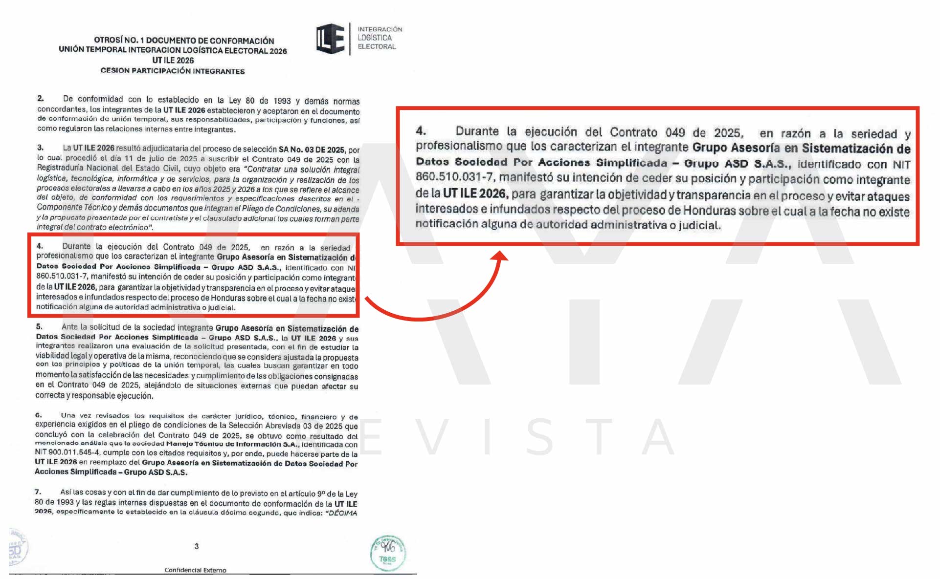 En el documento contractual ASD justificó la decisión de manera clara: por los cuestionamientos públicos que la rodean en Honduras, donde un exmagistrado del Consejo Nacional Electoral y un excandidato presidencial la han señalado por presunto fraude en las elecciones presidenciales del país centroamericano a finales del año pasado. Esa es la principal razón que expone esta empresa para renunciar al contrato y a las funciones que tenía: “Para garantizar la objetividad y transparencia en el proceso y evitar ataques interesados e infundados respecto del proceso de Honduras sobre el cual a la fecha no existe notificación alguna de autoridad administrativa o judicial”, dice el documento.