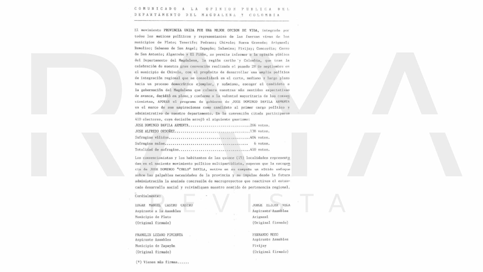 De ese encuentro salió el documento (ver foto) que después se conocería como el Pacto de Chivolo, firmado por cientos de asistentes y en el que se definió a José Domingo Dávila Armenta como candidato oficial a la Gobernación del Magdalena, cargo al que efectivamente llegó. Ese acuerdo marcó buena parte del rumbo del departamento en el nuevo milenio y, casi 26 años después, tres candidatos elegidos al Congreso tienen vínculos directos con las estructuras que surgieron de allí.