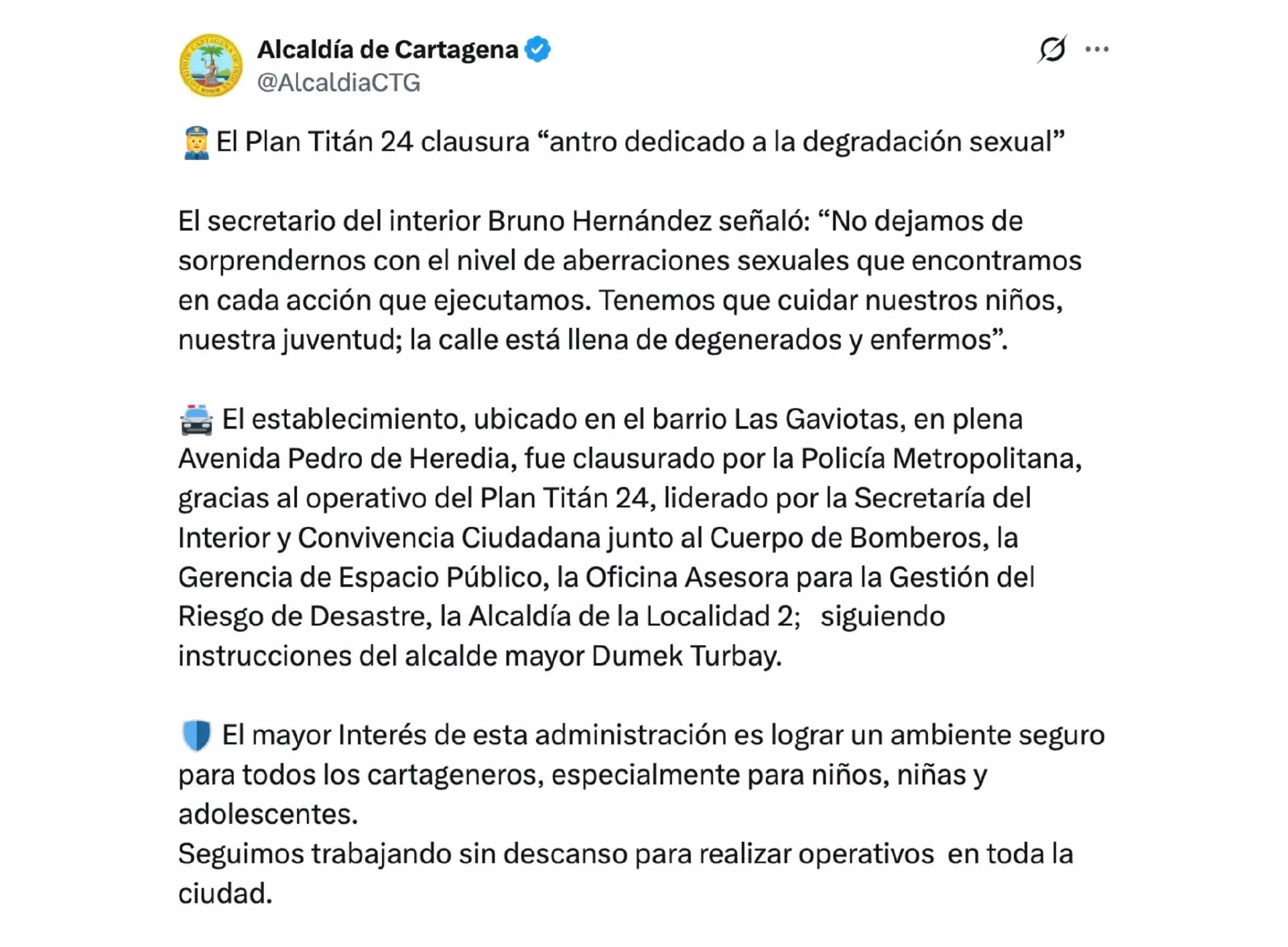 En particular, esto habría ocurrido con “un punto de encuentro para personas LGBTIQ donde había posibilidad de tener prácticas sexuales consentidas” en Las Gaviotas. Sobre la clausura, el secretario del Interior y Convivencia Ciudadana de la Alcaldía, Bruno Hernández, dijo: “No dejamos de sorprendernos con el nivel de aberraciones sexuales que encontramos en cada acción que ejecutamos… la calle está llena de degenerados”.